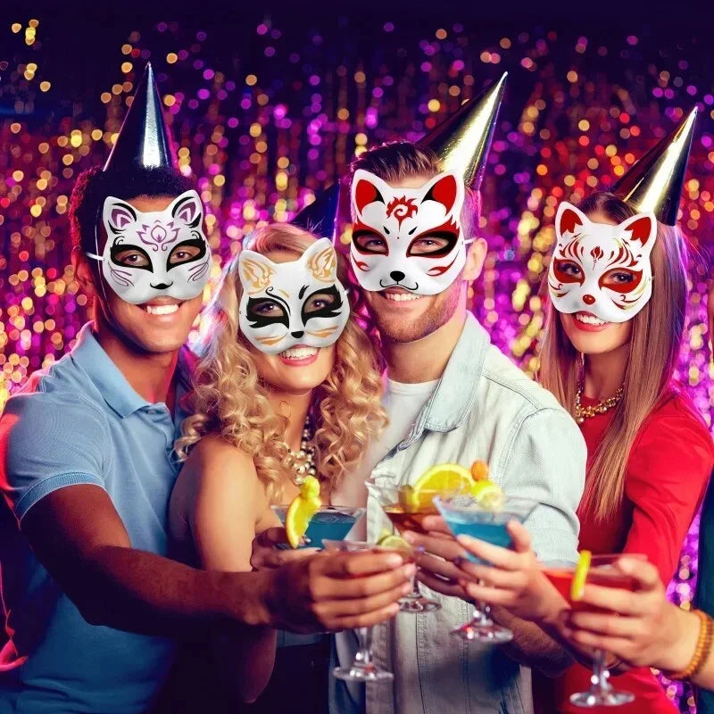 These Japanese-style paper masks, designed for ages 18 and above, feature a cat face model and measure 18 by 17 cm. Made from paper with elastic straps, they come in white and exclude paint. Ideal for costumes and cosplay, the masks are available in sets of 1, 5, 10, 15, or 20 pieces.