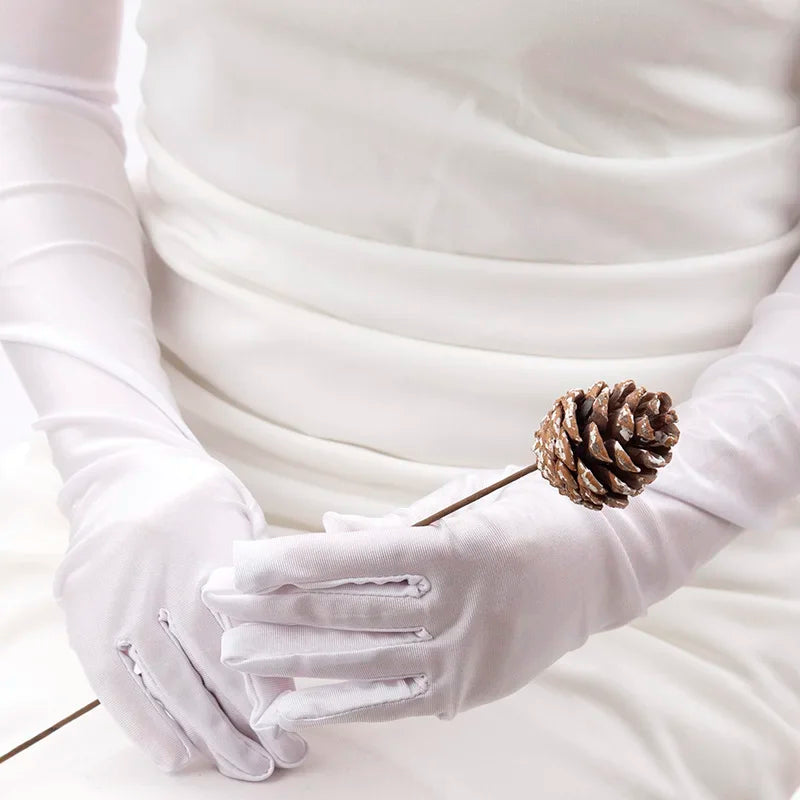 These classic opera-length gloves are crafted from stretch satin for a comfortable, sleek fit that extends gracefully to the elbow. Available in black, white, red, and grey, they offer versatile colour options to complement any vintage or flapper-style costume. The long, fingered design adds an elegant touch, making them perfect for formal events, theatre, or themed parties where sophistication and style are essential.