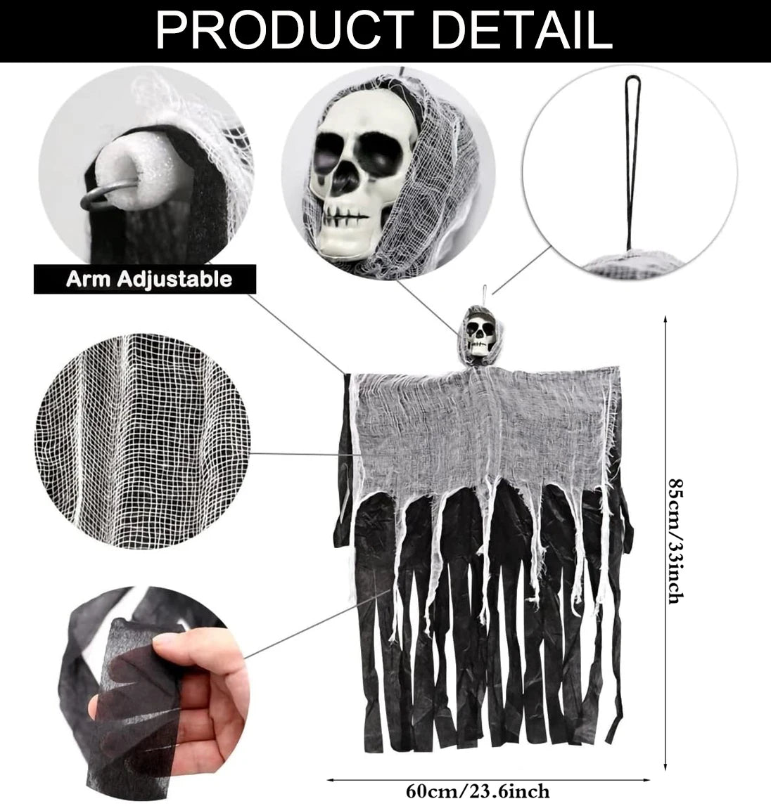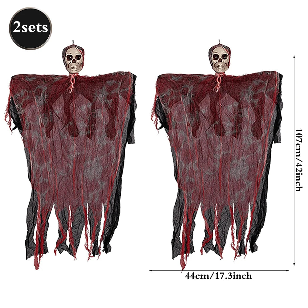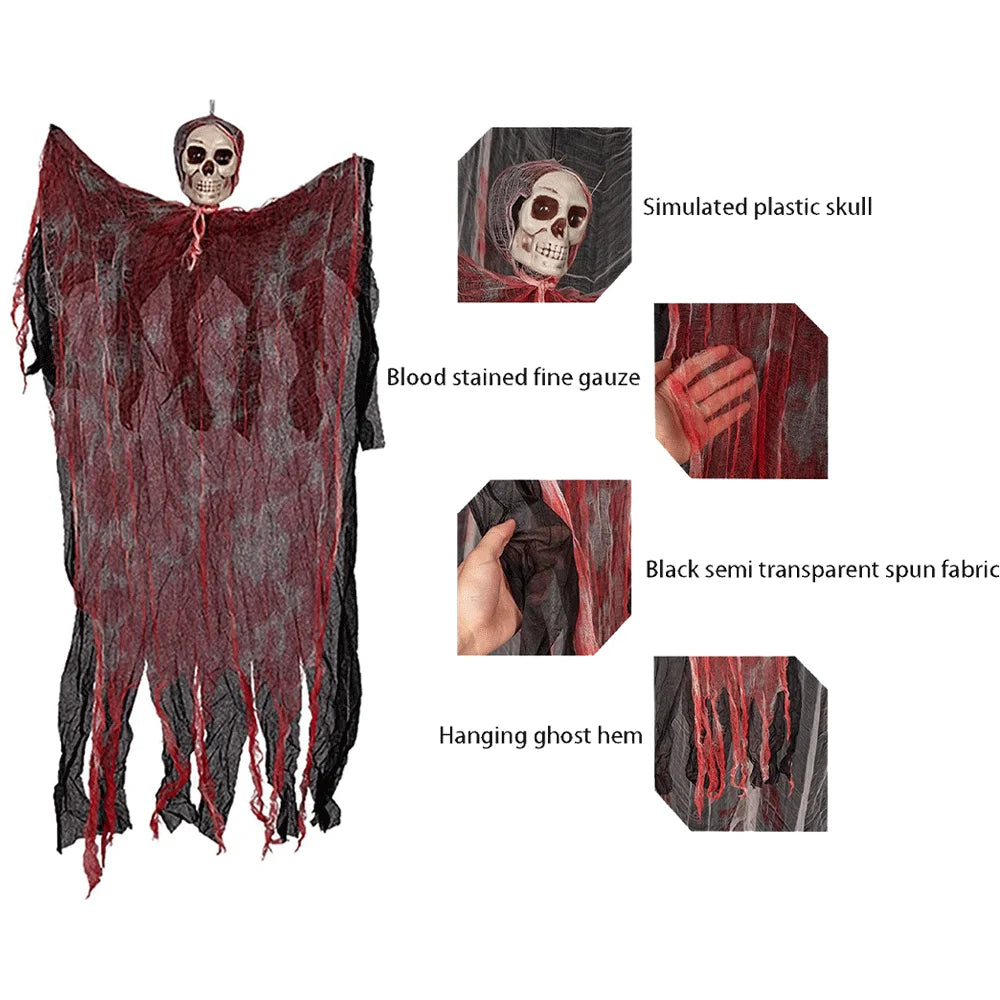 This Halloween hanging decoration features cloth-crafted ghosts, skulls, and grim reapers designed to create a spooky atmosphere for outdoor yards or parties.