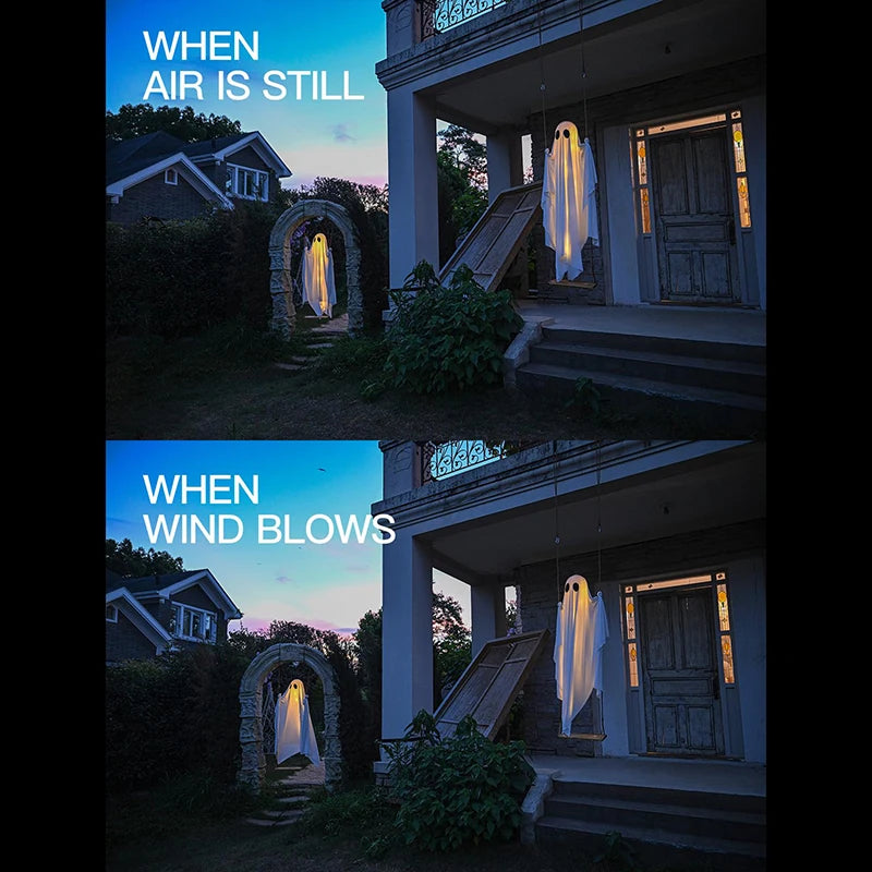 Bring a spooky yet charming touch to your outdoor spaces with this large hanging swing ghost decoration. Featuring integrated string lights, this ghost brightens porches, courtyards, or trees with an eerie glow that enhances the Halloween atmosphere. Its sizable design ensures high visibility, making it a standout piece that combines festive fun with seasonal spirit. Ideal for crafting an inviting and playful Halloween display while adding a touch of light to autumn evenings.