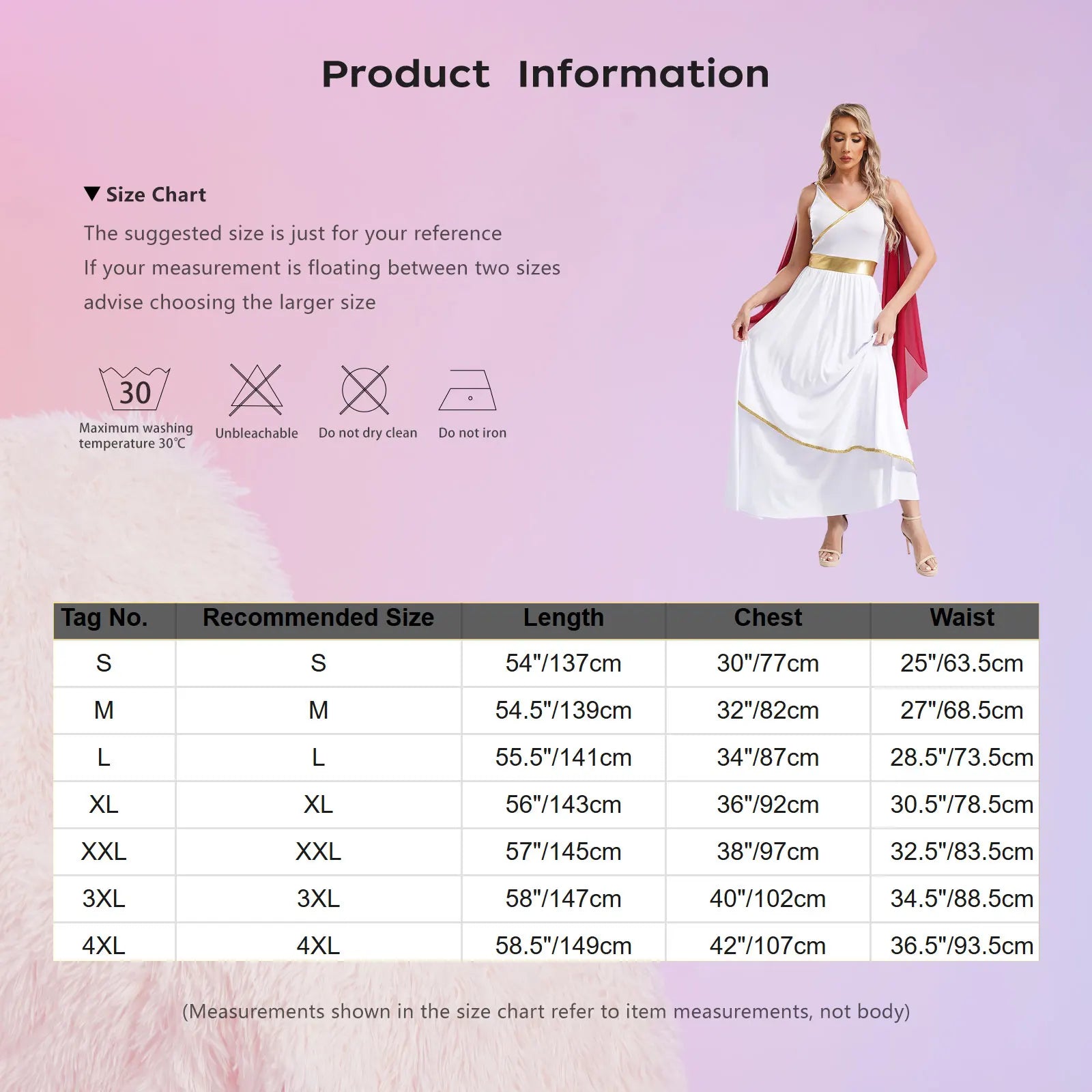 Size Chart: The suggested size is just for your reference. If your measurement is floating between two sizes, advise choosing the larger size. (Measurements shown in the size chart refer to item measurements, not body)